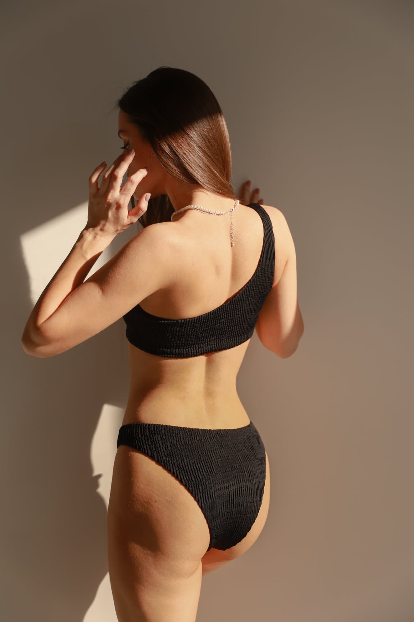 Склад: 95% поліамід, 5% еластан. Асиметрія – це один із ключових трендів сезону 2026, що дозволяє створити динамічний та сучасний образ. А жатка, її рельєфна структура, виглядає більш цікаво, ніж гладка, додаючи образу елегантності та певної «родзинки». З ЧАШКАМИ для підтримки та обʼєму. Трусики-бразиліани або інші: сліпи, стринги, з високою посадкою