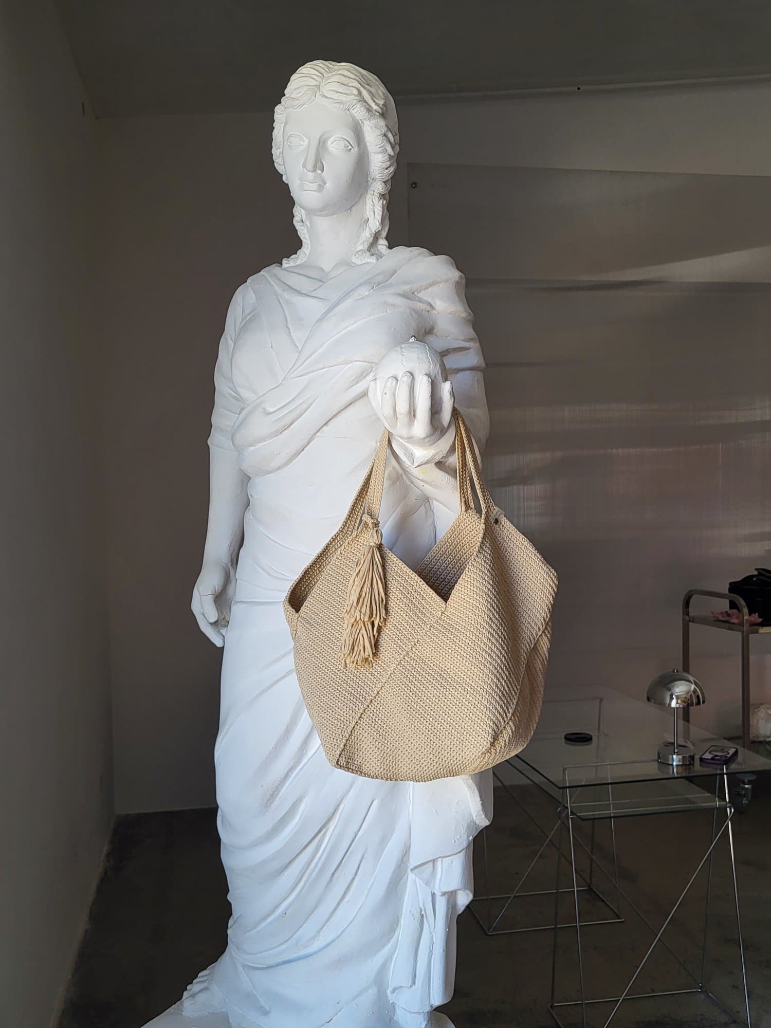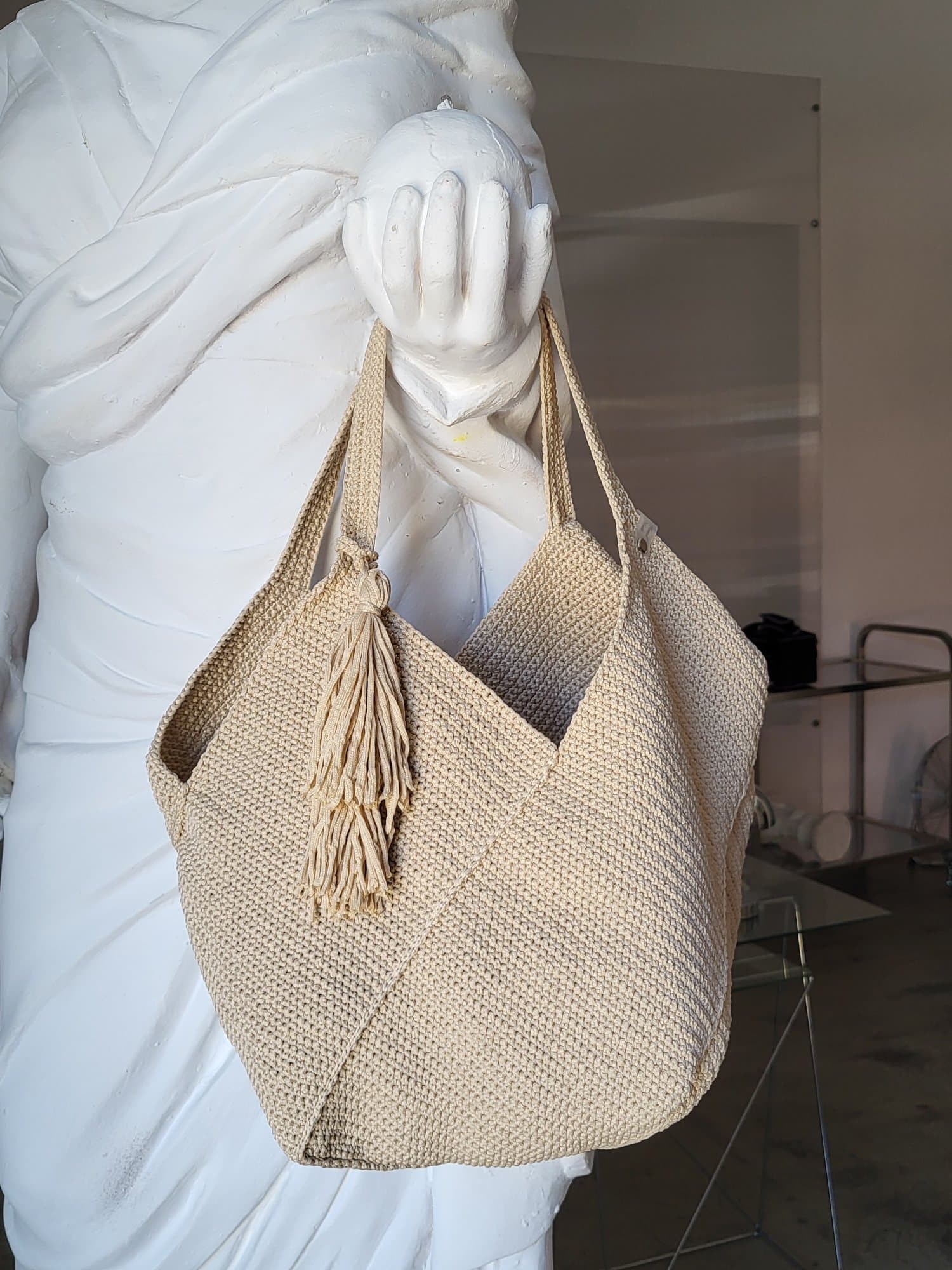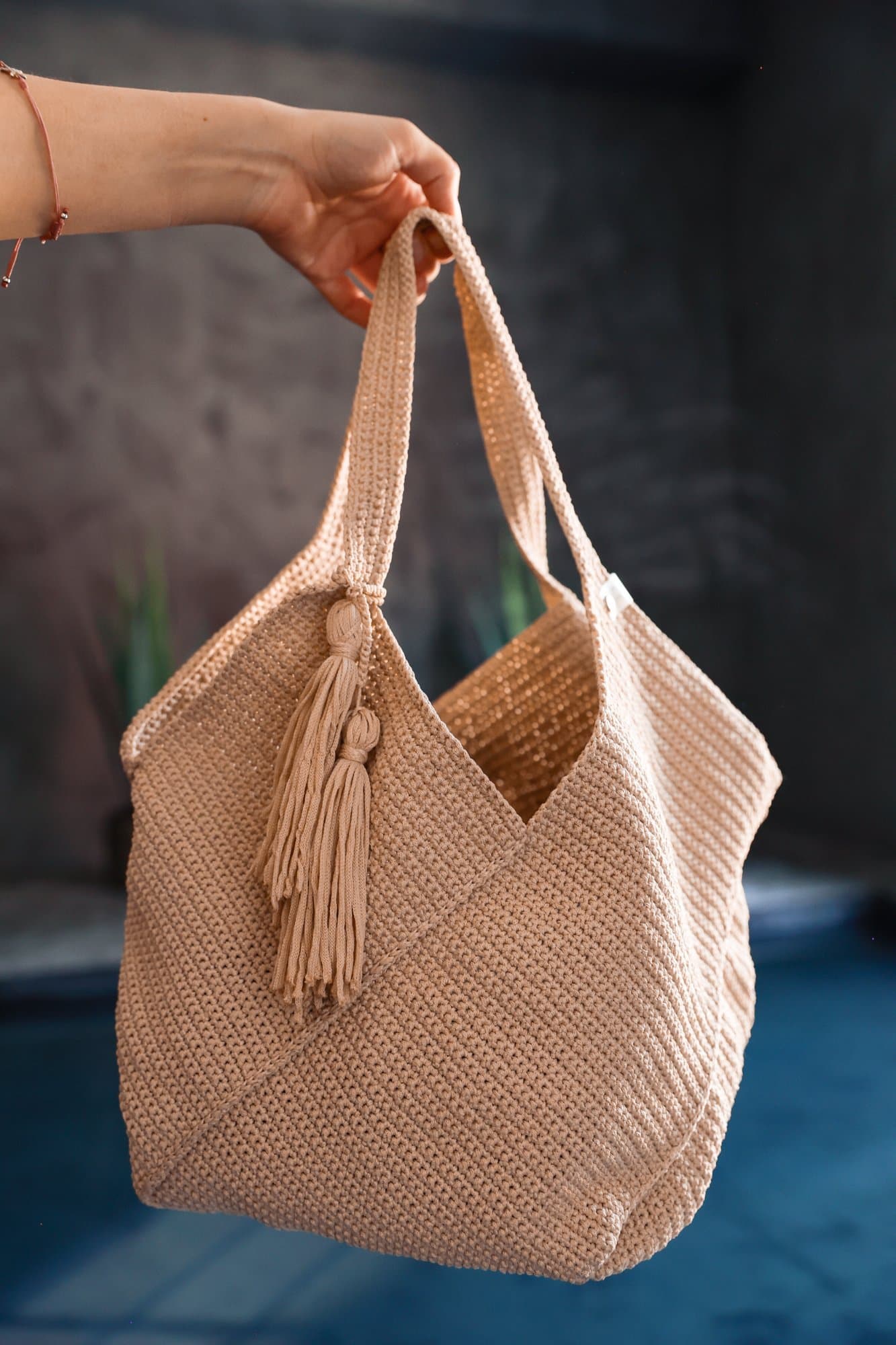 Склад: 100% синтетичний плетений матеріал Розміри: 40см × 28,5см × 28,5см (ширина, висота, глибина) 100% ручна робота. Це оригінальна в'язка, що якісно виділяється на фоні іншого мас-маркету. Сумка виготовлена з поліефірного шнура - це якісний синтетичний плетений матеріал, сумки з нього: ✔️ міцні і зносостійкі ✔️ гіпоалергенні ✔️ стійкі до вигорання на сонці ✔️ легкі ✔️ невибагливі у догляді